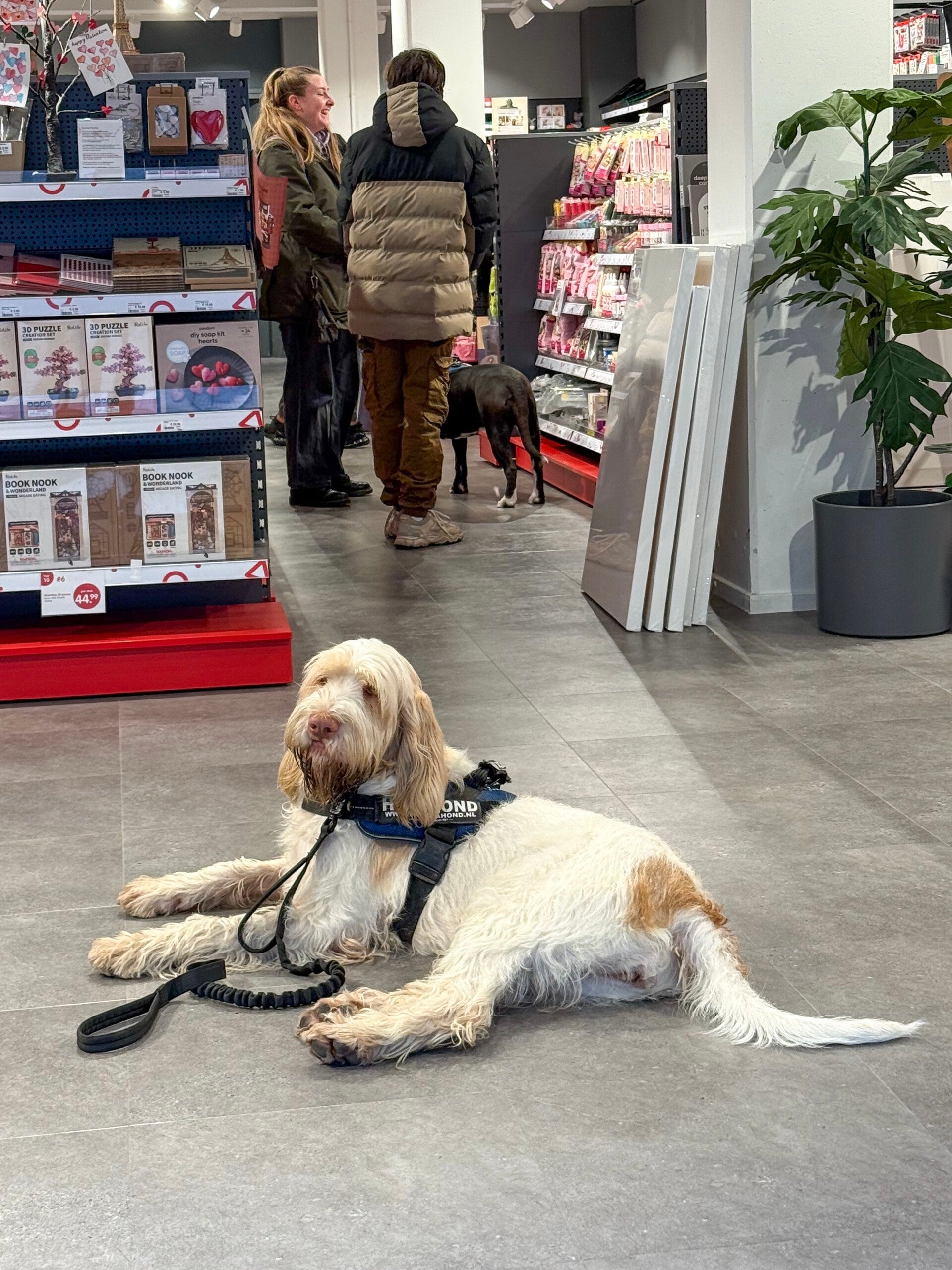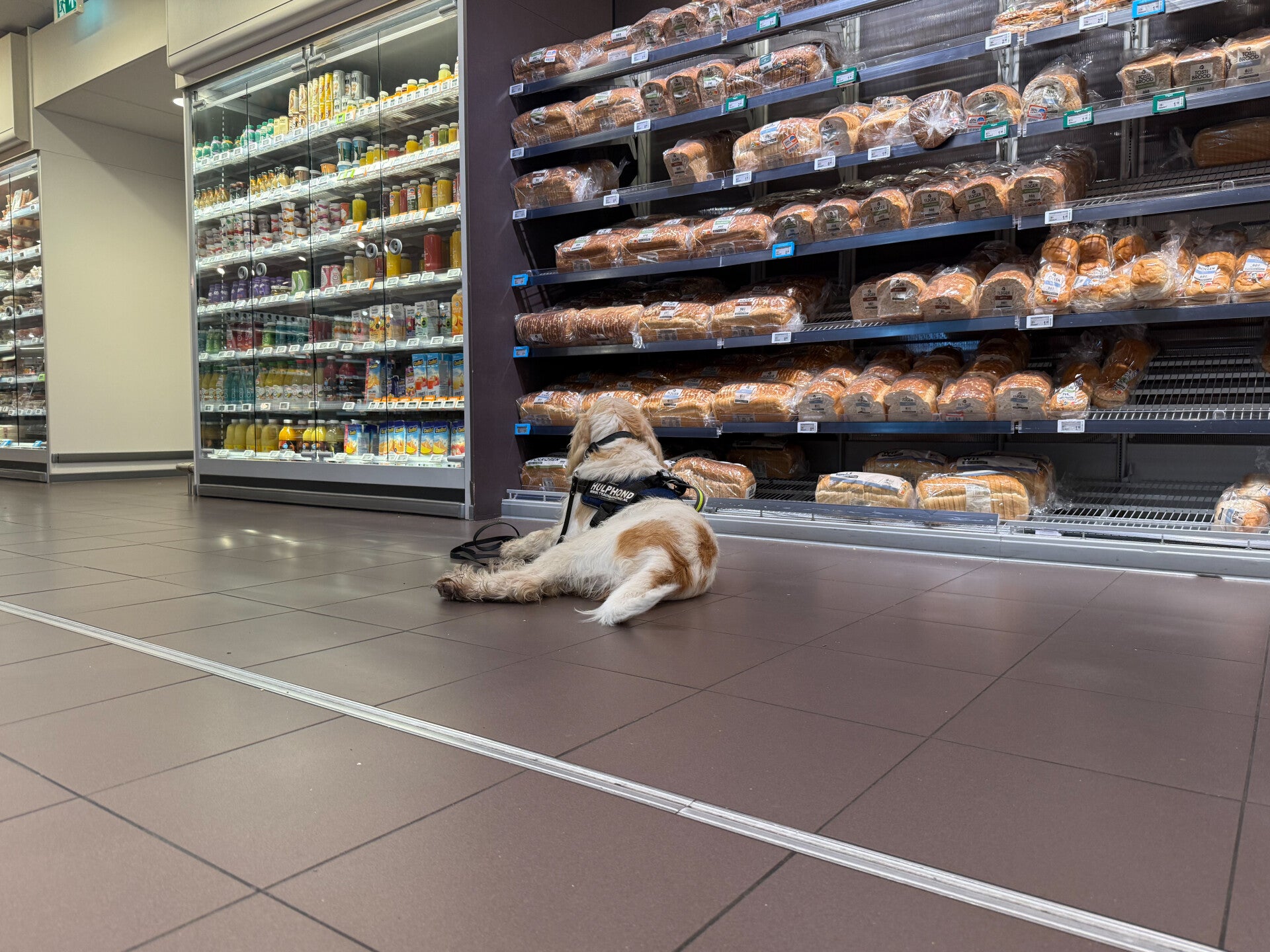In de supermarkt trainden we ook bij de broodafdeling. Bella vindt brood heel lekker ruiken en ze kijkt er ook naar. Maar ze blijft toch liggen. Dat is heel knap van haar.