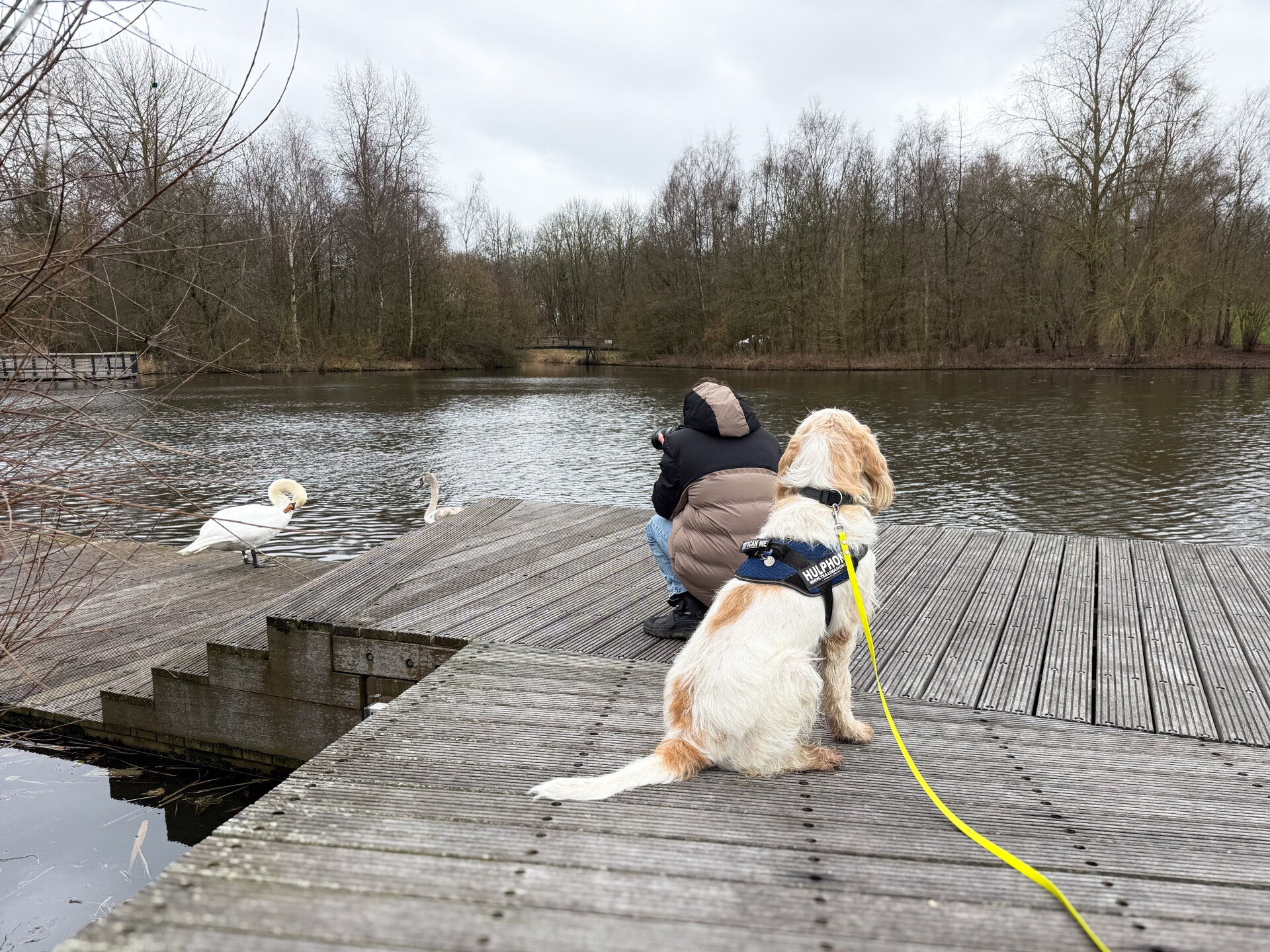 Toen ik foto’s maakte van de zwanen in het water bleef Bella netjes naast me wachten en keek zelf ook gezellig rond. Dat doet ze echt heel goed.