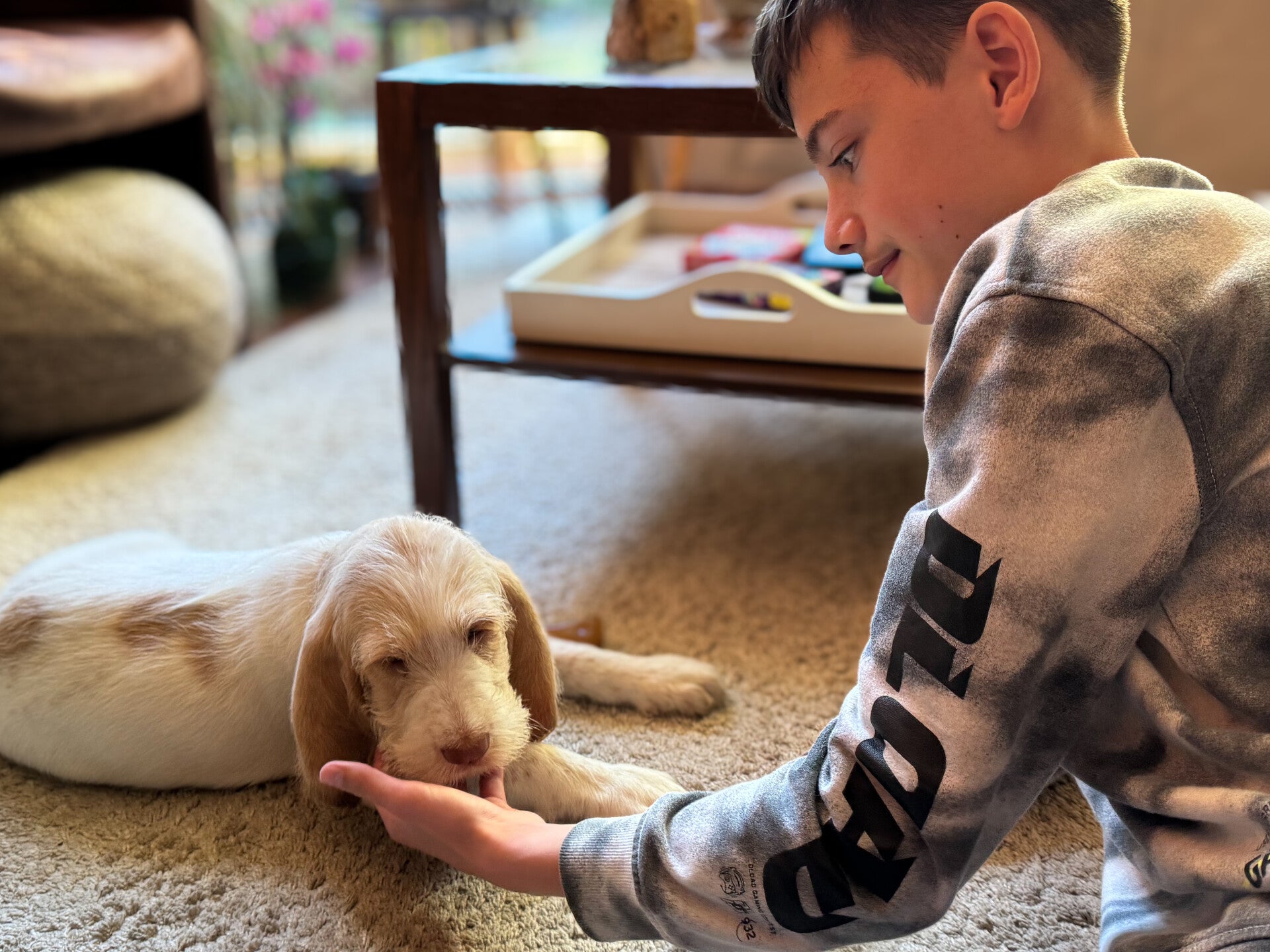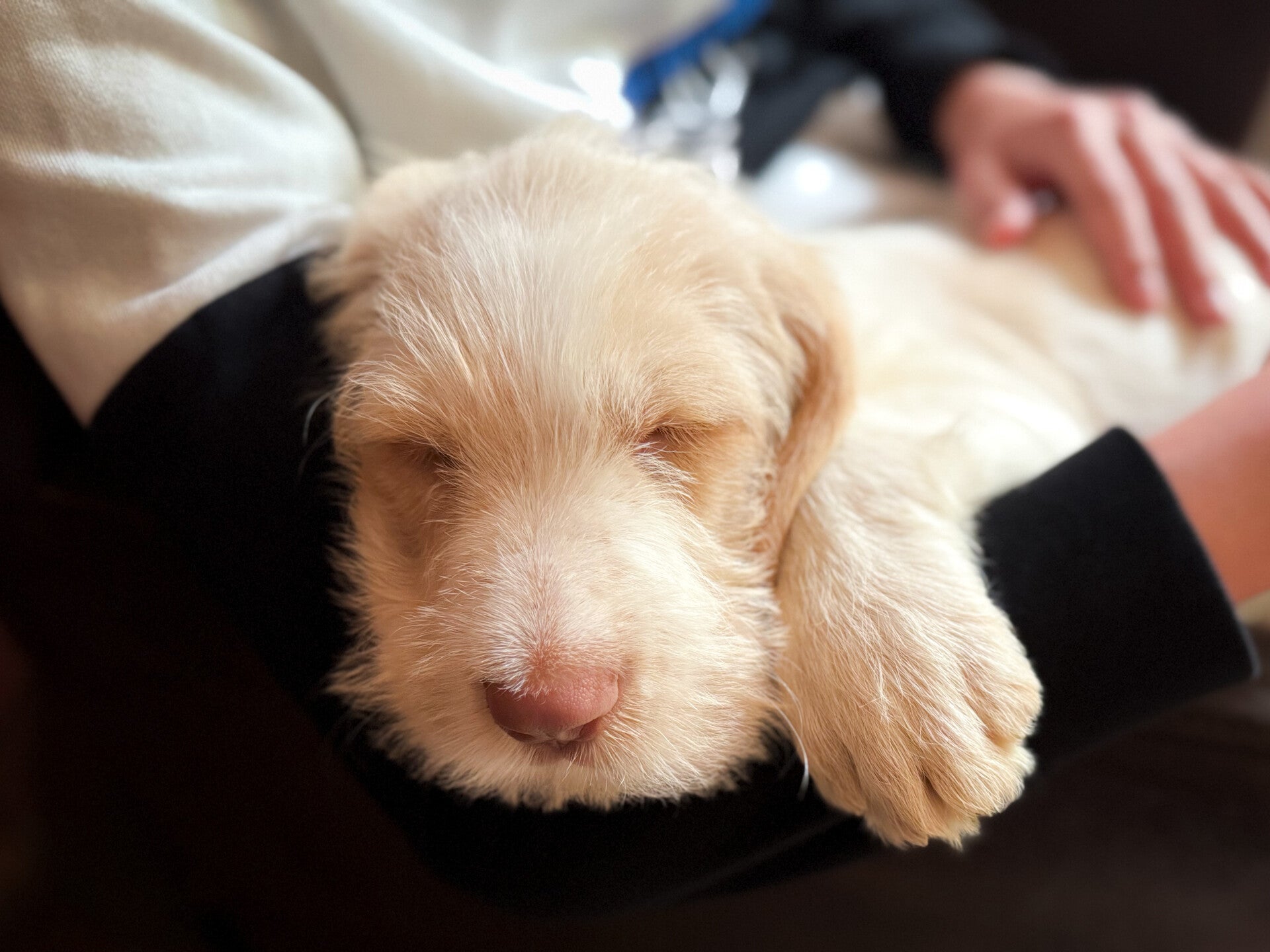 Wat is het schattig zo’n kleine puppy in huis. Het is heel veel werk maar het is ook heel gezellig. Sylvano geniet volop! En ondertussen begint de training, al vanaf dag één!