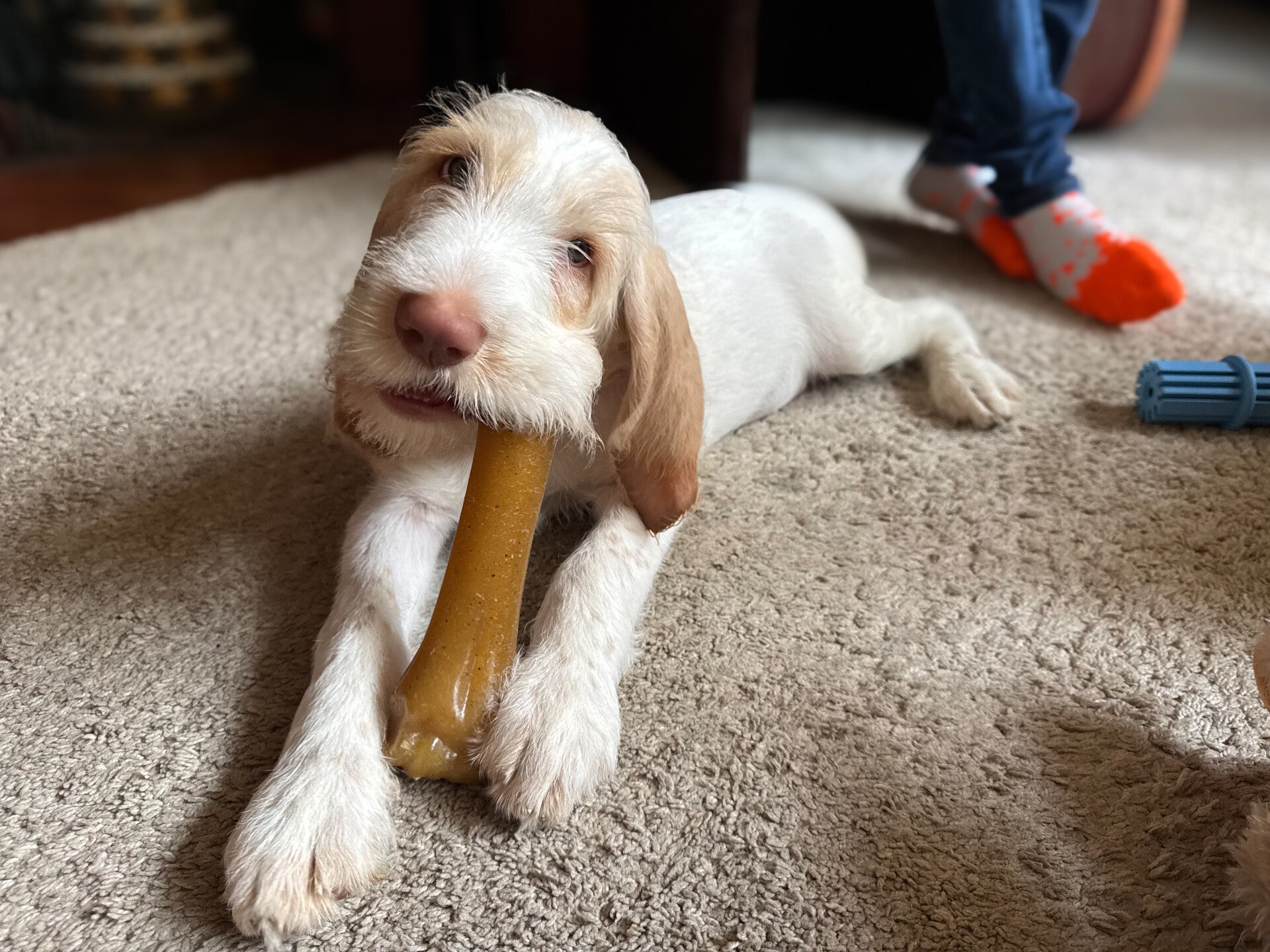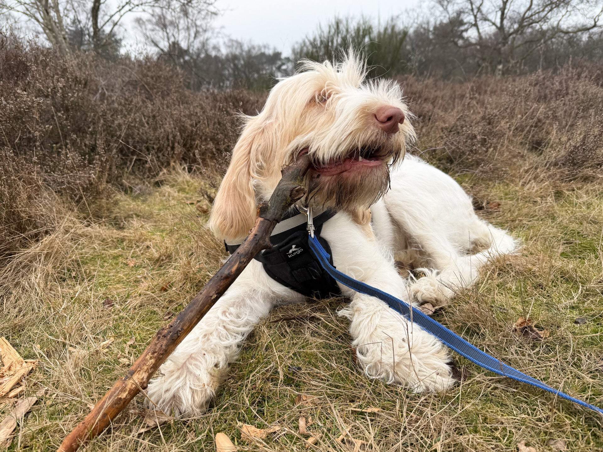 Bella bijt graag schors van takken af. Daarna spuugt ze het uit. Sommige takken zijn giftig voor honden, daar letten we goed op.