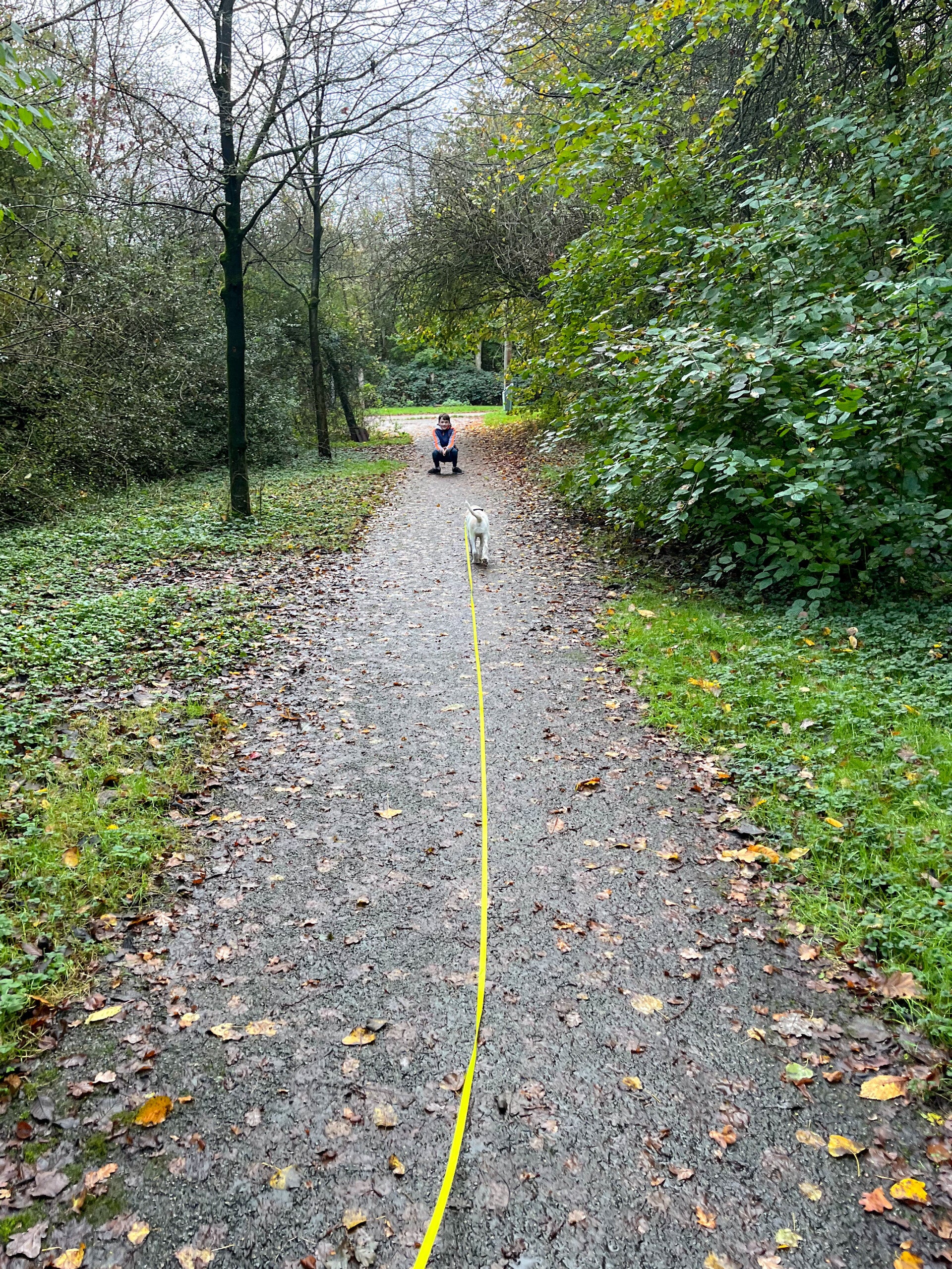 In dit filmpje zie je hoe Opa en ik met Bella aan de lange lijn oefenen dat ze naar ons toekomt als we haar roepen.